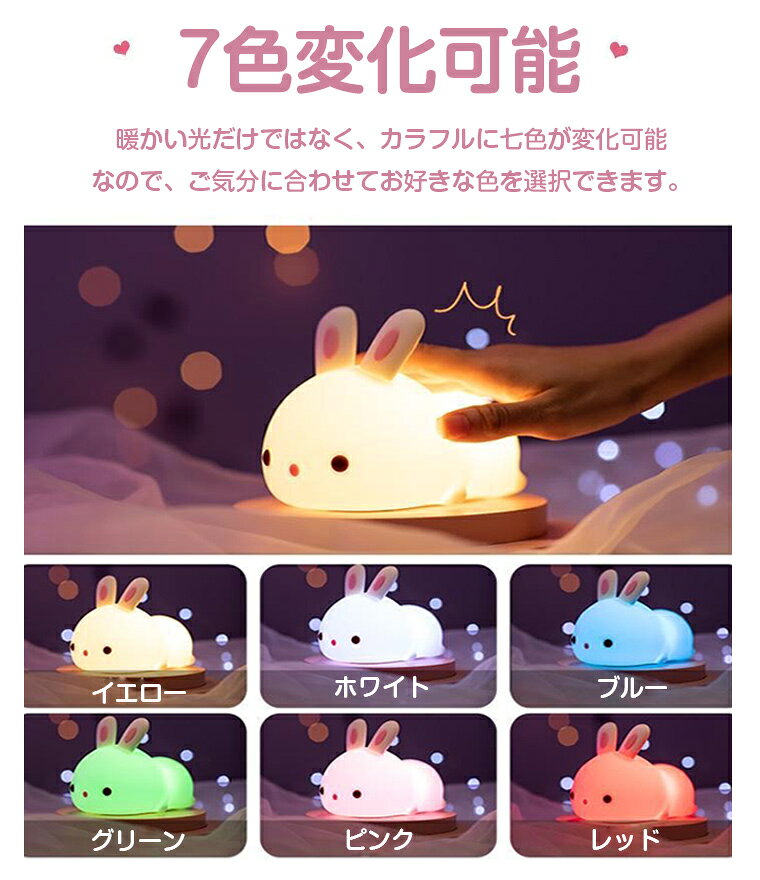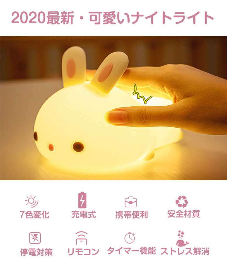 【叩き式】ナイトライト 授乳 かわいい 子供部屋 ベビー テーブルランプ コードレス 充電式 常夜灯 間接照明 おしゃれ ベッドサイド LEDライト 目に優しい シリコン リモコン付き USB 1800mAh 学習 読書 寝室 叩く 7色変化 ウサギ 送料無料 クリスマス