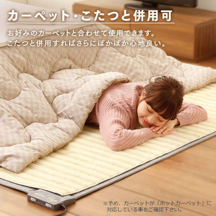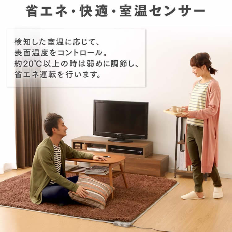 ■商品サイズ(cm)幅約176×奥行約176■コード長さ約1.5m■定格消費電力500W■温度調節無段階■暖房面積切替○(右、左、全面)■表面材質ポリエステル100%■表面温度/消費電力/電気代(1時間当たり)温度調節目盛 弱:約35℃/約215W/約5.8円温度調節目盛 強:約45℃/約324W/約8.7円室温センサーで検知した室温に応じてホットカーペットの表面温度をコントロールします。